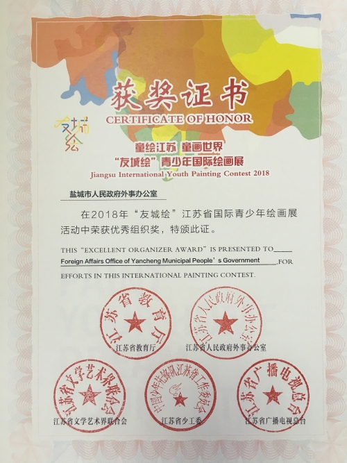 为庆祝江苏省国际友好城市交流40周年,进一步推动中华文化走出去,加强与世界各国特别是“一带一路”沿线国家的文化交流与合作,增进各国青少年之间的友谊,省外办举办了2018年“友城绘”江苏省国际青少年绘画展。我办高度重视,认真研究,综合考量,向我市瑞典友好交流城市布罗斯市、盐都区德国友城茨维考市发出参赛邀请。经过几个月的准备和筛选,两市共提交了64幅优秀作品参加“友城绘”活动。经过组委会评选,德国茨维考市的作品获得三个一等奖、六个二等奖和八个三等奖,瑞典布罗斯市的作品获得三个三等奖。我办、德国茨维考市和瑞典布罗斯市均获得优秀组织奖。(国交处)