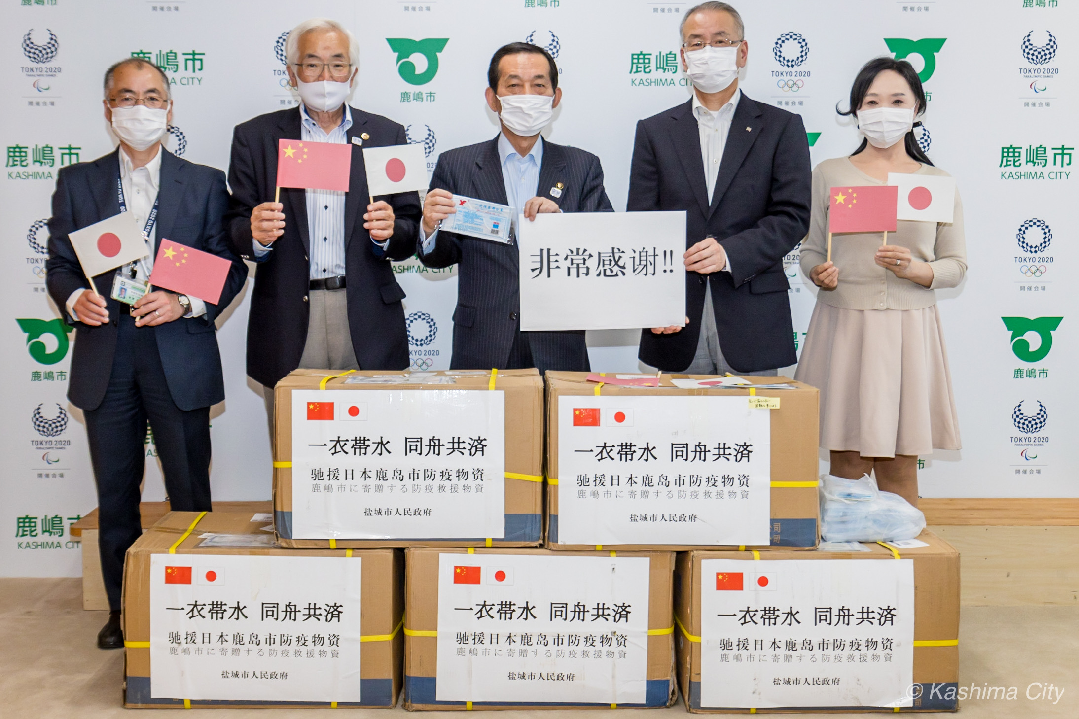 5月20日,我市向日本友城茨城县鹿岛市捐赠的10000只一次性医用口罩抵达鹿岛。图为鹿岛市市长锦织孝一(中)、鹿岛市副市长市村修(左二)、鹿岛市日中友好协会会长千叶功(右二)、茨城县日中友好协会副理事长高滨孝美(右一)、鹿岛市政府市民生活部部长津贺利幸(左一)在受赠现场。(亚洲处)