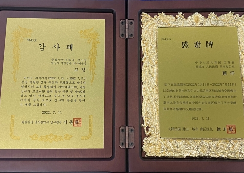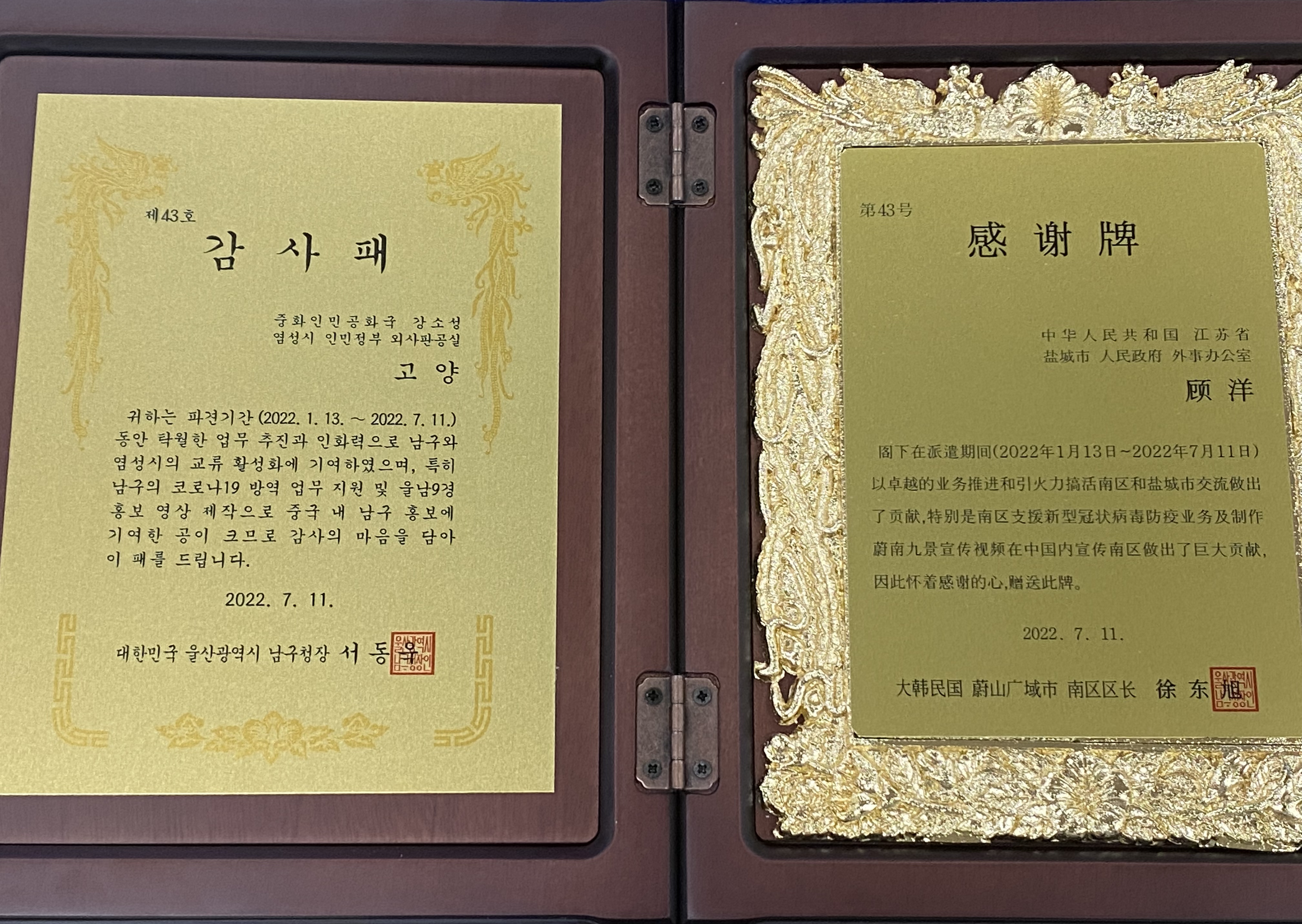 感谢牌落款署名为蔚山广域市南区区长徐东旭,内容是:“感谢阁下在派遣期间(2022年1月13日~2022年7月11日),以卓越的业务能力和活力为搞活南区和盐城市交流做出了贡献,特别是支援南区新型冠状病毒防疫业务及制作蔚南九景宣传视频在中国内宣传南区做出了巨大贡献,因此怀着感谢的心,赠送此牌。”