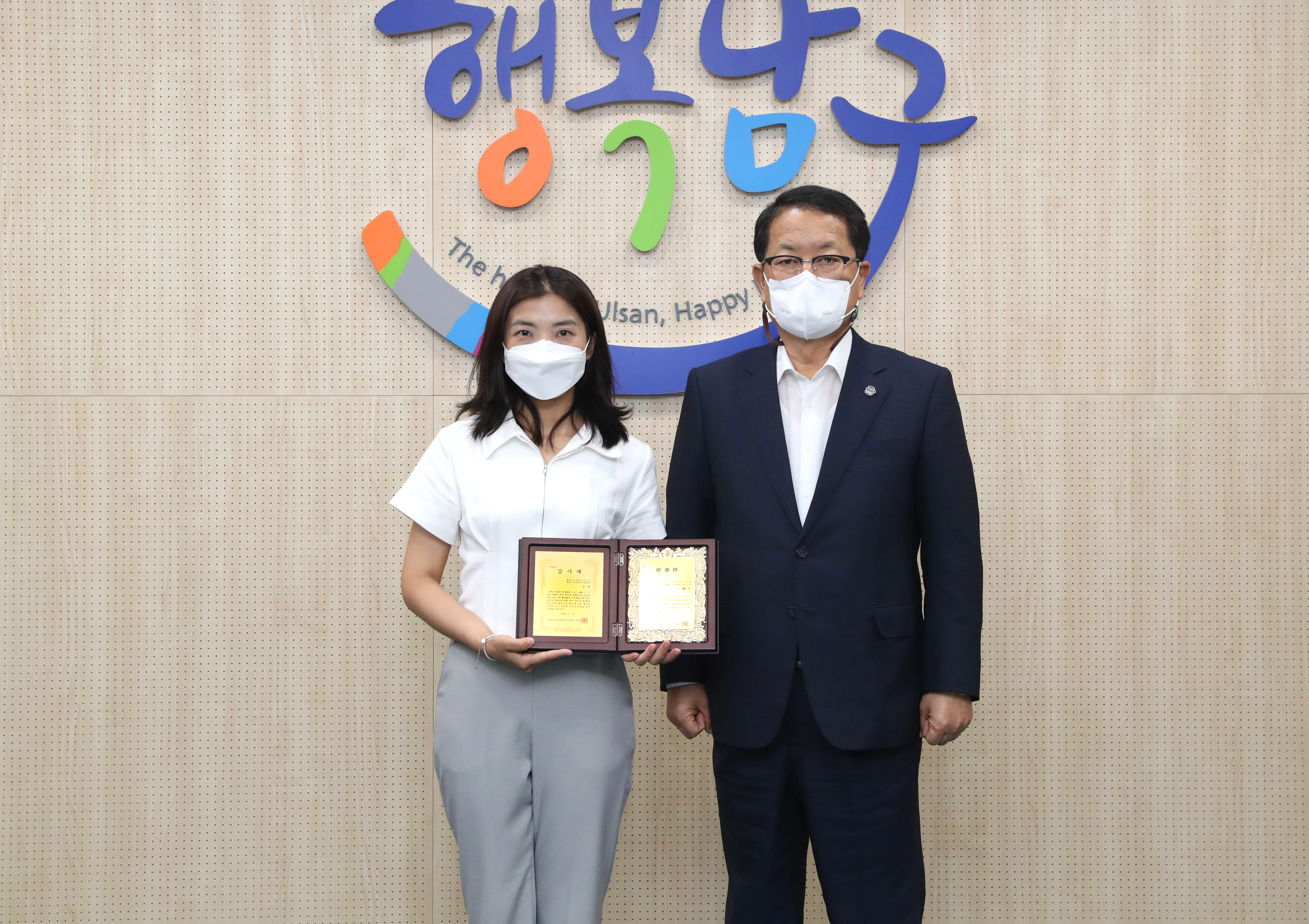 7月7日,蔚山广域市南区特地举行仪式向我市派遣公务员颁发感谢牌,蔚山南区徐东旭区长出席活动并向我市派遣公务员颁发感谢牌,以表彰其在派遣期间为两市(区)建立友好城市关系及推动交流合作所作出的贡献。